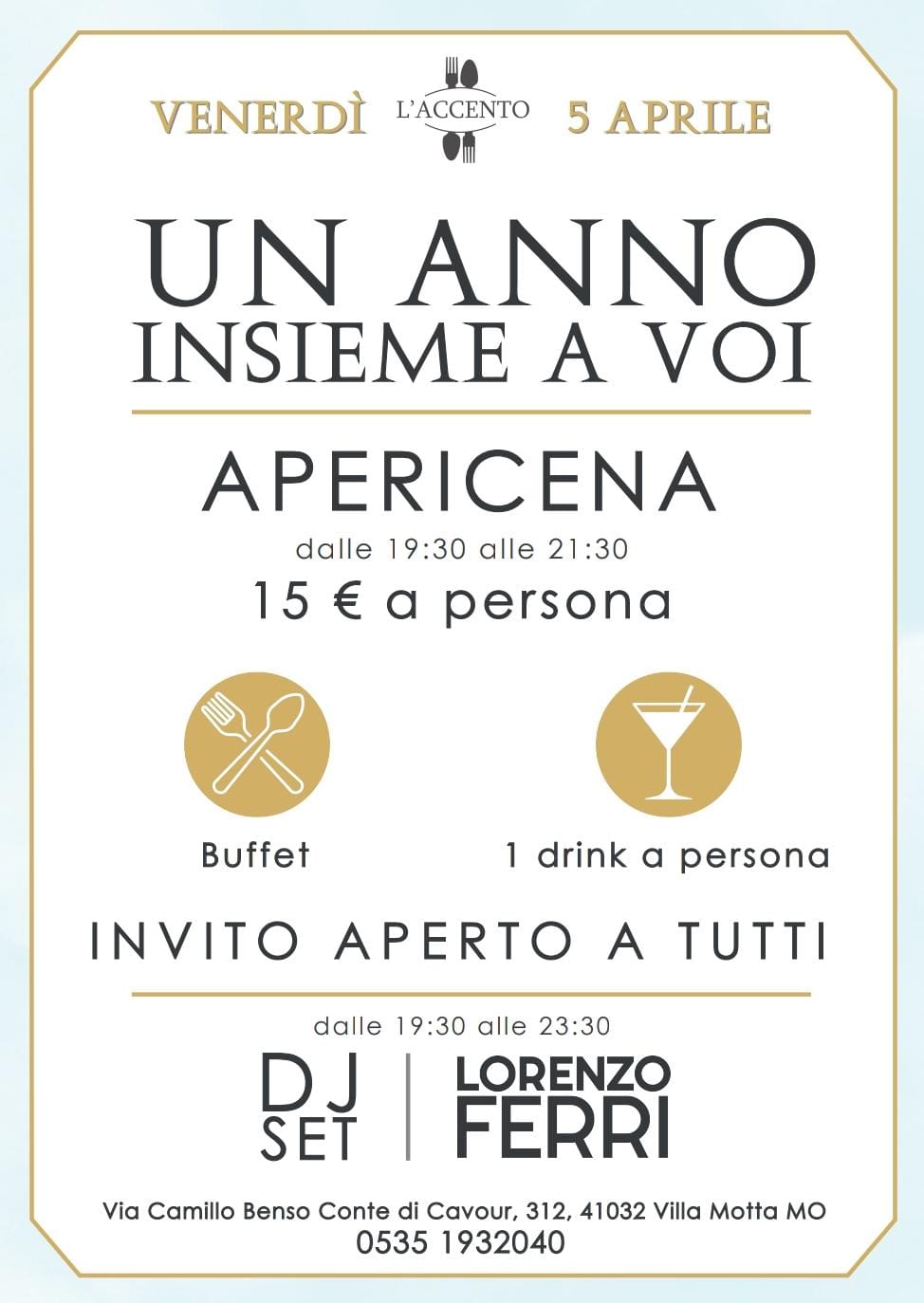 Vieni a festeggiare insieme a noi con un apericena a 15€ a persona con buffet, un drink a persona e dj set!
