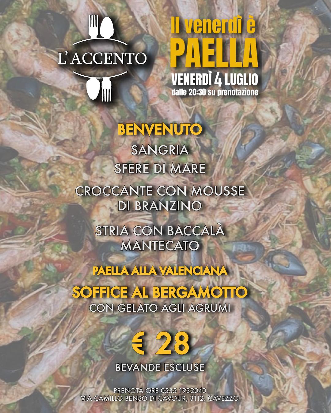 Scopri il nostro menù di ferragosto, con calice di benvenuto, entrée di Canestrello e Sfera di scottona, il tutto seguiro dalla nostra paella cucinata a vista a soli 30€ a persona!